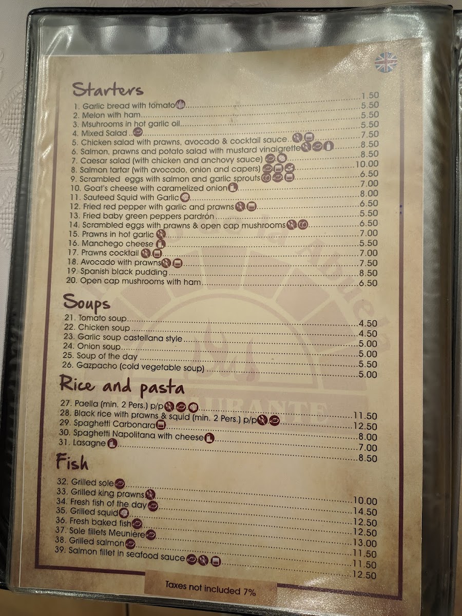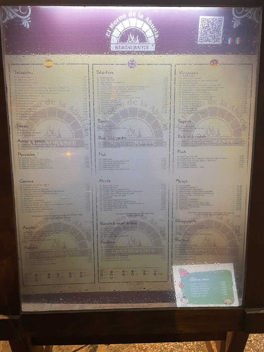 The menu at El Horno de la Abuela features a range of traditional Mediterranean and Spanish dishes, focusing on both meat and seafood options. Visitors can expect classic Spanish specialties such as various types of rice dishes including Black Rice with Prawns & Squid, Mixed Paella, and Arroz Negro. There are also several meat dishes like Steak Diane, Fillet Steak with Pepper Sauce, Lechazo de Segovia, and Rinderfilet in Roquefort sauce.